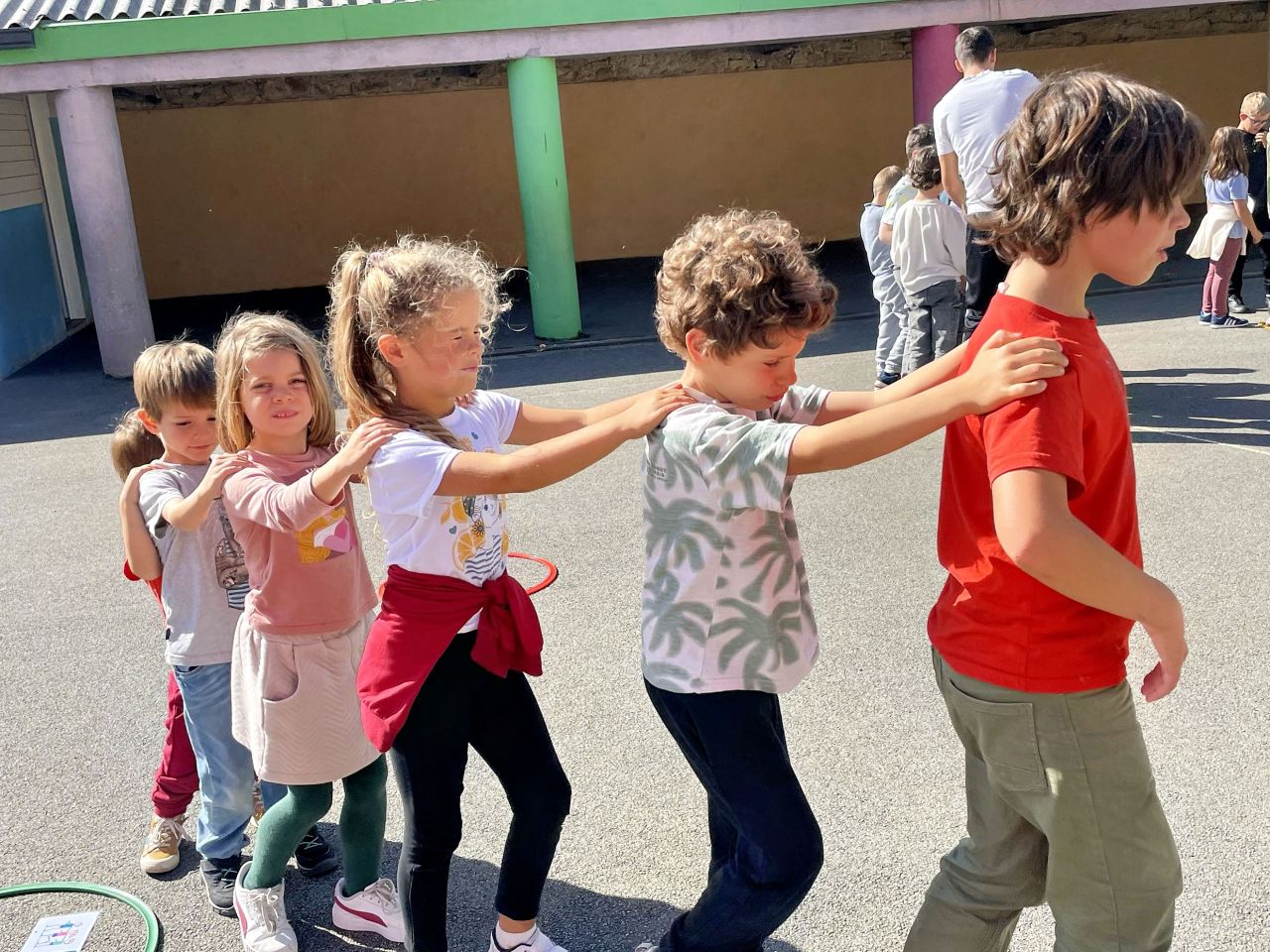 Se déplacer en équipe en se donnant la main, en se touchant